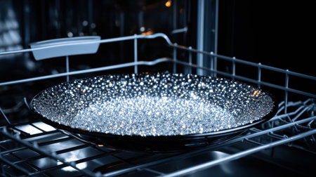 Gleaming dishware rests inside a dishwasher, showing the effectiveness of modern cleaning technology in a home kitchen setting.