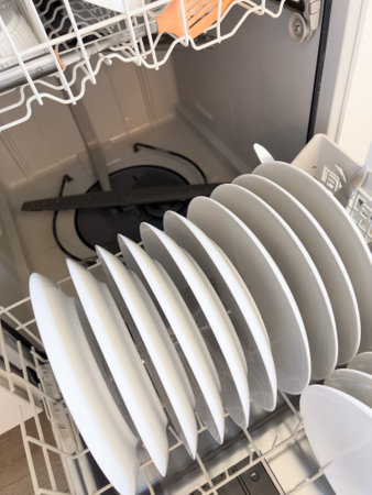 Sparkling Clean White Dishes Inside of a Residential Dishwasher, Ready for Family Dinners at Home