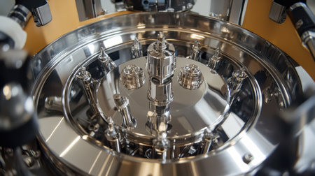 This image captures a close-up view of a shiny precision metal component within an advanced industrial machine, highlighting the sophistication and detail of modern engineering.