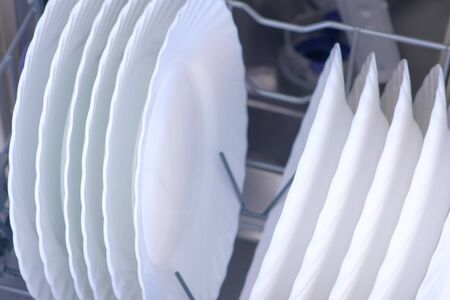Washed porcelain white plates in the dishwasher. Cleaning and cleanliness concept. Vertical photo.