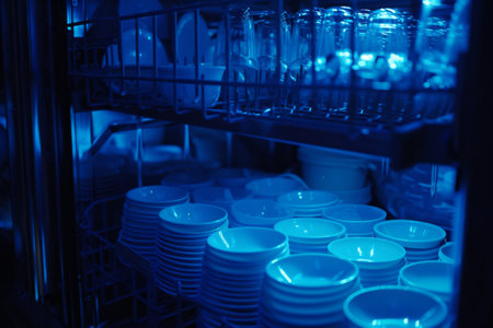 Crisp image of clean dishes inside an open dishwasher illuminated by soft blue backlighting
