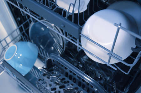 Open dishwasher machine with clean dinnerware in the kitchen, closeup