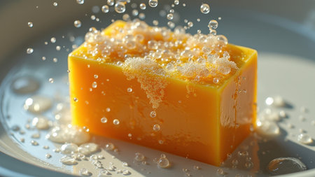 Close-up of orange bar of soap with bubbles on white plate in sunlight. That the image is generated using AI.