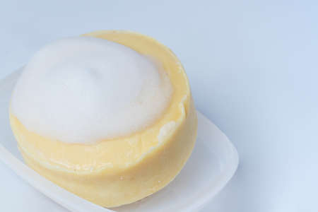 hand made soap in lush white foam on a light blue background. cosmetic background minimalistic concept.