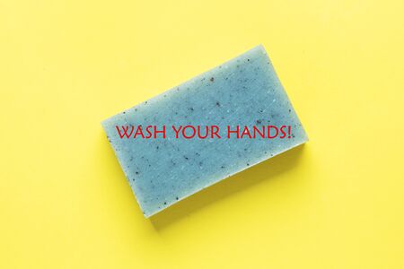 Natural herbal soap on a yellow background. The inscription Wash your hands