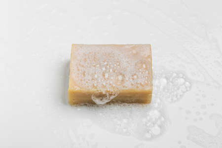 Organic antibacterial wet natural handmade square soap bar with white foam and bubbles on bathroom tile on light beige background with copy space used in shower for healthy skin