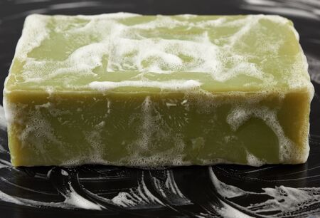 bar of natural green soap with white foam on a black background, hygiene concept , close up