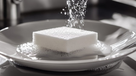 A dishwashing sponge cleaning the surface of a white ceramic plate, leaving a sparkling clean trail.