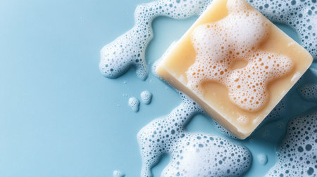 Closeup of foamy soap bar on pale gray-blue surface, gentle cleanliness concept, top view