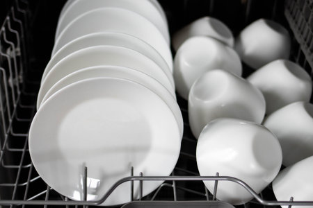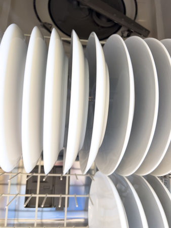 Modern dishwasher with neatly arranged clean white plates inside. Kitchen appliance for easy and efficient dishwashing. Household technology saving time and water, offering convenience and hygiene in everyday life.