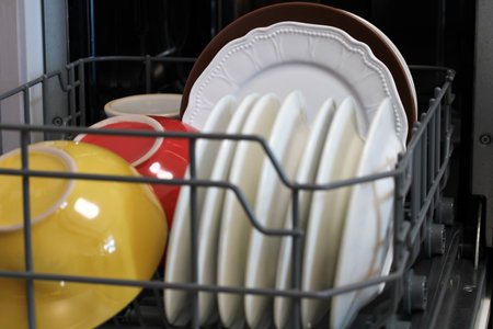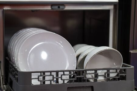 Close-up of plates in the dishwasher. Household chores and washing dishes.