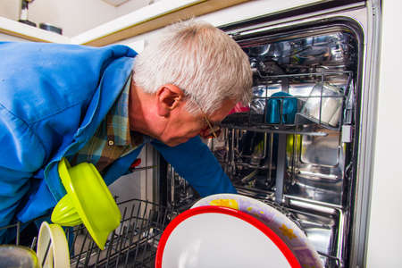 An old age plumber wearing blue uniform and repairing dish washer machine