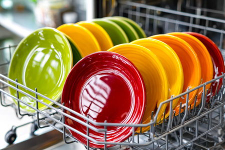 Colorful ceramic dishware including bowls, plates, and mugs are neatly arranged in an open dishwasher, ready for cleaning