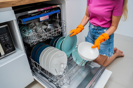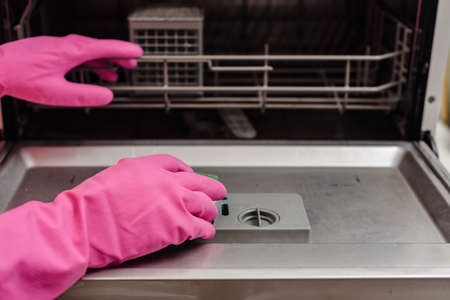 Female hands taking care of dishwashing machine for better cleaning