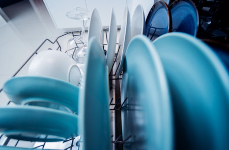 A detailed shot of a tidy kitchen dishwasher interior showing spotless white dishware and precisely organized utensils, bathed in gentle lighting with a blurred contemporary bac
