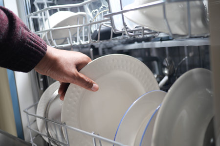 Female hand loading dished, empty out or unloading dishwasher with utensils. Kitchen appliances, lifestyle view. Woman puts a plate in the dishwasher or takes from it. Housewife does her housework.