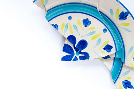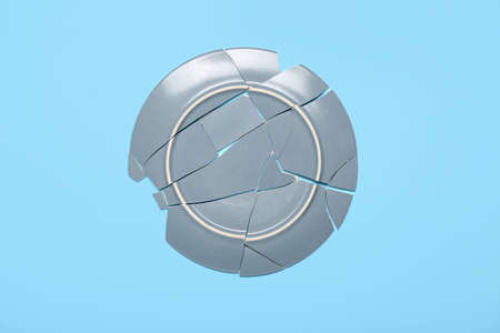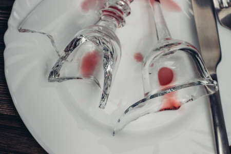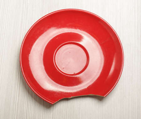 Broken Plate or broken water glass on the on the red background The concept of accidents in the kitchen is dangerous for the body and young children inside the house.
