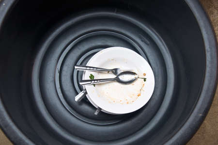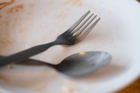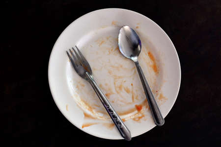on a dark metal plate, an empty white plate with a spoon, stained after eating