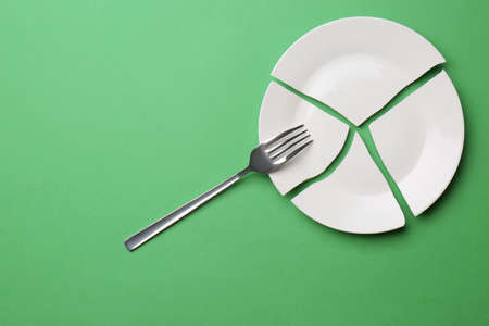 Pieces of broken ceramic plate and fork on green background, flat lay. Space for text