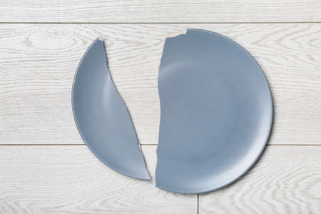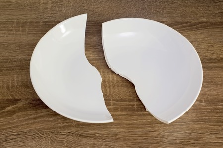 A close-up of a cracked ceramic plate with broken pieces scattered on a wooden countertop, symbolizing a kitchen accident.