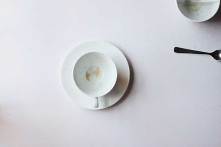 Used coffee cups and spoons stacked in a sink after coffee consumption