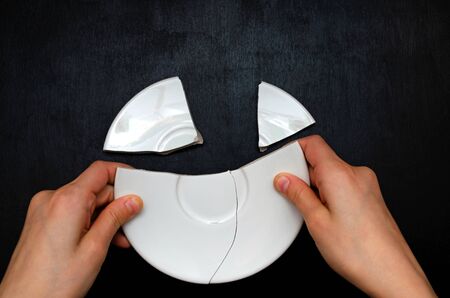 children's hands stack the fragments of a plate together. the concept of punishment. broken white plate in small hands on a black background close-up