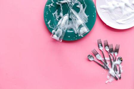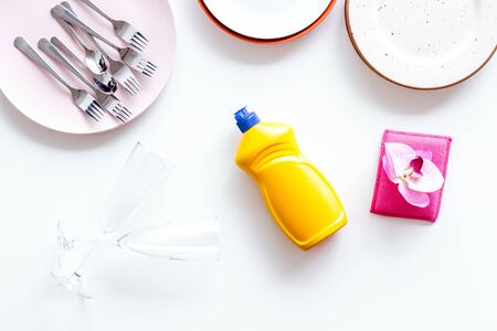 Washing dishes concept. Plates, spoons, forks on white background top view