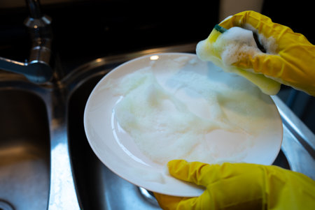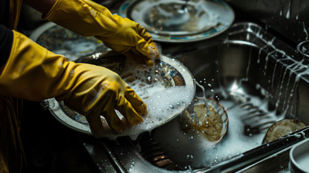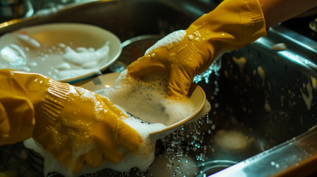 A close-up shot of hands washing a plate in a sink filled with soapy water. Water flows from above, creating bubbles and a vibrant kitchen atmosphere. Perfect for domestic cleaning themes.