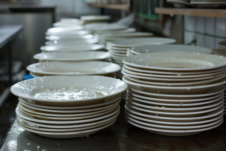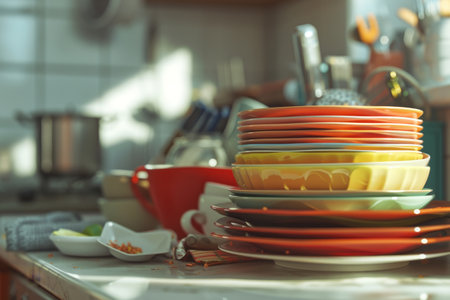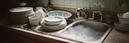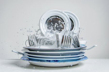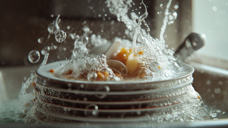 A captivating moment of water splashing over a stack of plates, highlighting the beauty of daily chores and the freshness of a well-maintained kitchen environment.