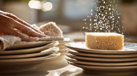 In a bright kitchen, a person washes dishes with a sponge, sunlight creating reflections on the clean plates stacked nearby.