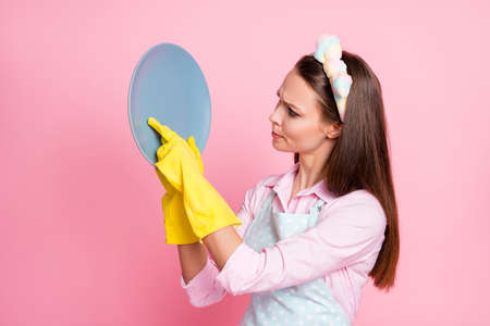 Profile side photo of frustrated wife neat girl look kitchenware see dirt touch finger protective gloves wear trendy dotted shirt isolated over pastel color background