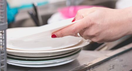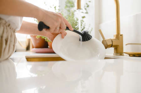Woman washing dishes in the kitchen. Close up of woman hand. Housewife clean dishes.