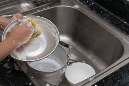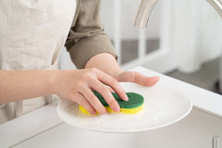 Close up of woman housewife is doing the dishes at home kitchen by using wash sponge and dishwashing.