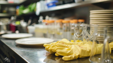 Scene captures a chef actively cleaning dishes in a busy restaurant kitchen, showcasing the daily operations and importance of hygiene in food service.