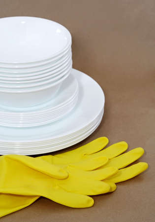 Rags, sponges, gloves and a set of dishes on a white table. The concept of cleaning and maintaining cleanliness.