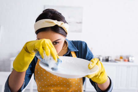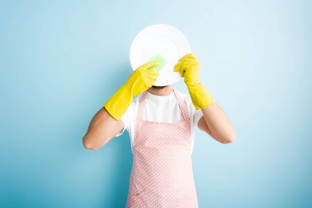 Close up of female hands in yellow protective rubber gloves washing white plate with blue cleaning sponge against white background