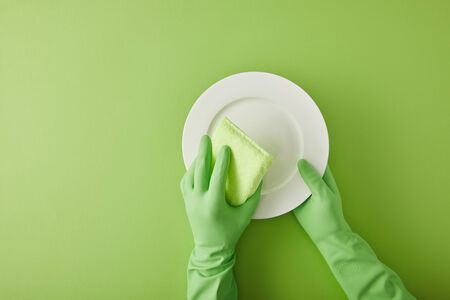 Top view photo of hands in green rubber gloves holding white plate and using green scouring pad on isolated green background with blank space