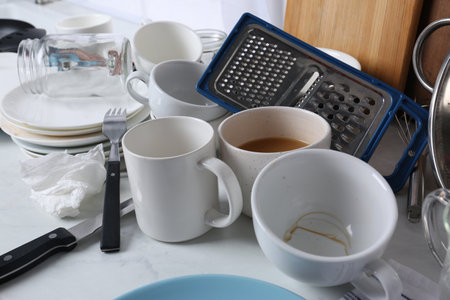 A kitchen counter with a pile of dirty dishes including cups, bowls, and spoons. The dishes are arranged in a disorganized manner, with some placed on the counter and others stacked in a pile
