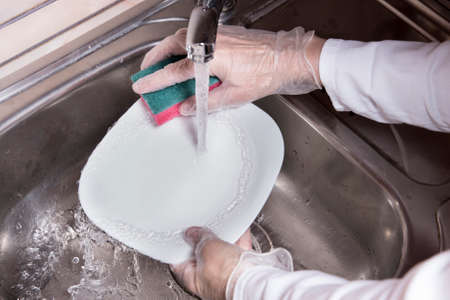 Woman's hands with gloves washing dish with fresh water at kitchen faucet over the metal sink. Human washes white plate. Close up of hand. Top view.