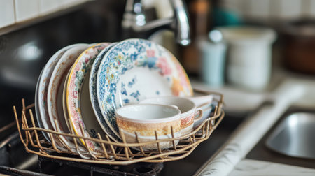 A charming collection of colorful vintage plates and delicate cups elegantly arranged in a stylish dish rack, showcasing a modern kitchen vibe.