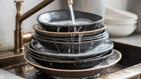 A collection of black ceramic plates stacked in a modern sink, being washed under a flowing faucet, showcasing home cleanliness and kitchen routine.