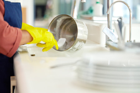 In a contemporary apartment, a woman wearing green gloves diligently cleans dishes in a sleek sink, showcasing a well-organized, modern kitchen environment.