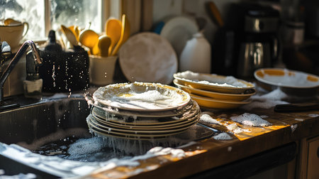 A cozy kitchen scene with a pile of dirty dishes in soapy water, foam spilling over a rustic sink, illuminated by warm sunlight streaming through the window.