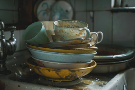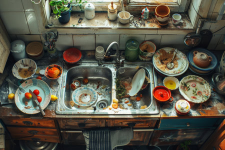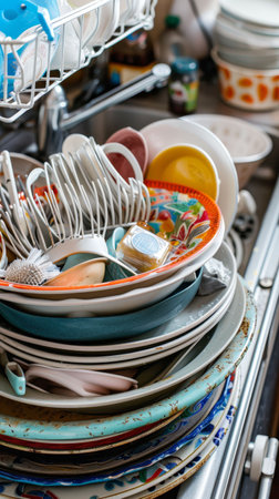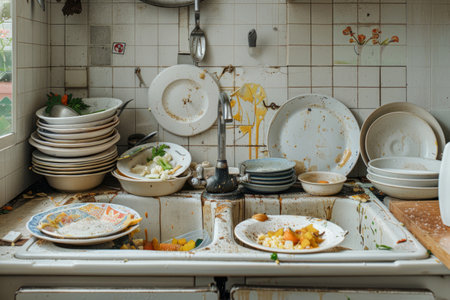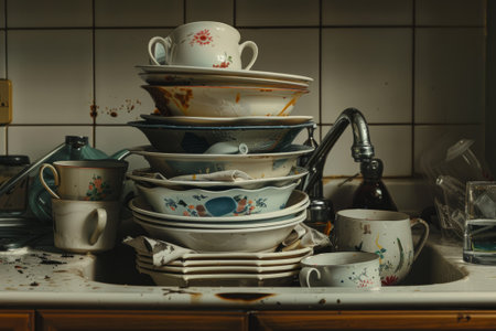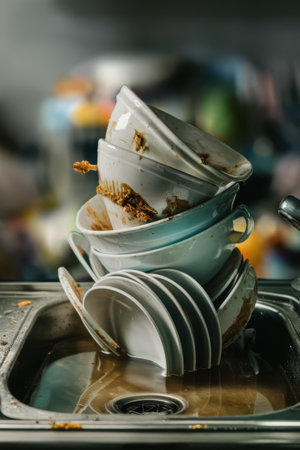 Unwashed dirty dishes clogging a white kitchen sink in a chaotic and messy scene.