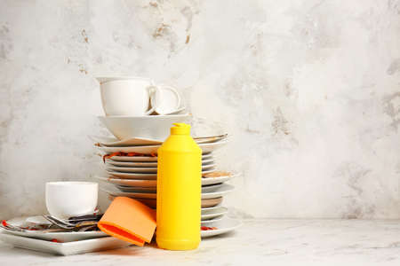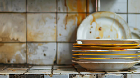 Stack of dirty dishes piled on grimy kitchen countertop with stains