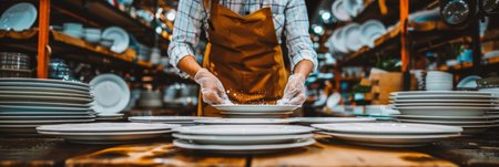 A dedicated kitchen worker, wearing a blue apron and gloves, carefully carries a stack of clean white plates in a bustling commercial kitchen environment.