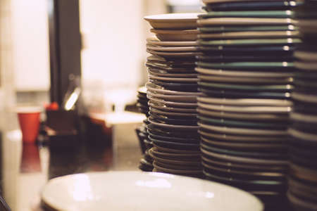 Empty plates (dishes) on a kitchen table in a restaurant. Dishes for restaurants.