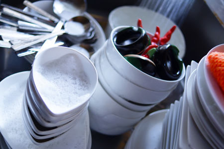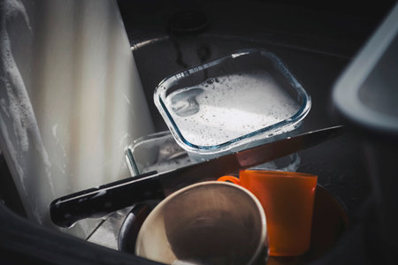 Washing dishes, Close up of utensils soaking in kitchen sink.