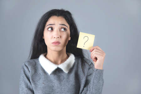 sad woman hand question mark on paper on grey background