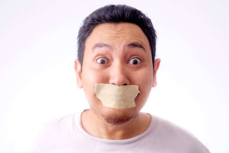 Portrait of Asian man shocked afraid worried with mouth closed, forbidden banned for talking